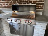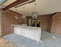 This backyard makeover that we recently completed in Coppell was designed and managed by Beautiful Backyard Living owner, Bobby Cravens. The patio cover has a full finish drop ceiling, meaning that instead of having a ceiling with an open area that follows the roof line, a lower ceiling was installed, finished out and painted. We love the beautiful white chopstone that the customer chose for the bar area, and especially the decorative light fixtures above the bar! A ceiling fan was added to keep the patio cooler in hot weather, and a heater for cold winter barbecues.